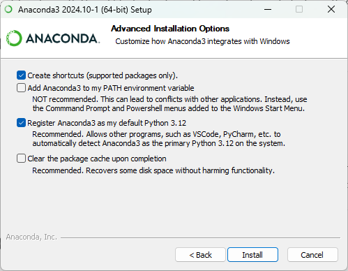 - Register Anaconda3 as my default Python 3.X: 선택하면 Anaconda의 Python이 시스템 기본 Python으로 설정됩니다.