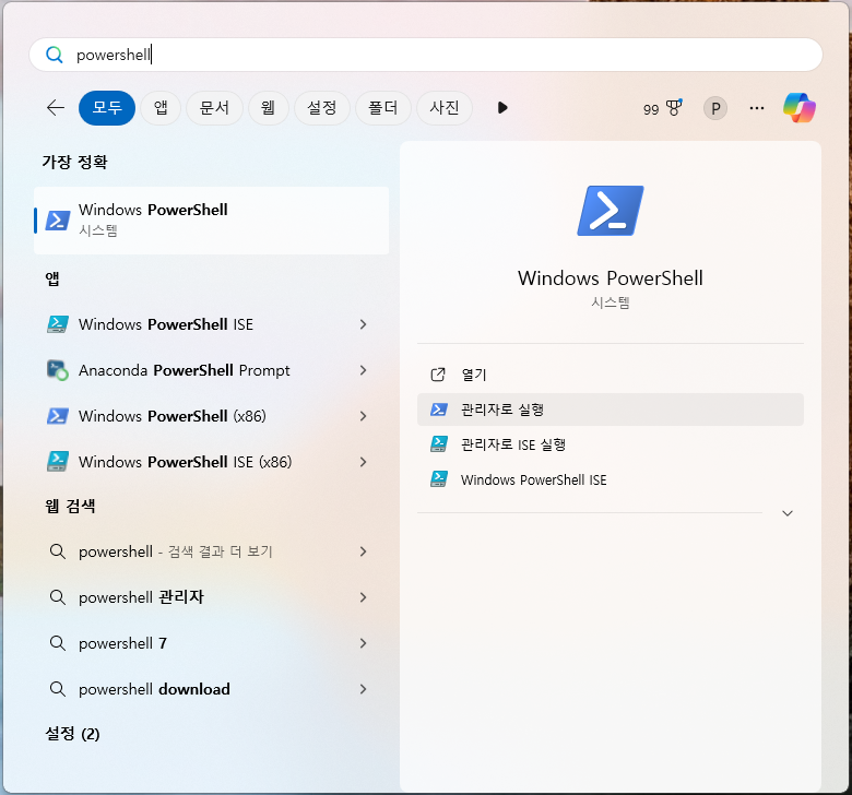 시작 메뉴를 연 후, Windows PowerShell 또는 PowerShell을 찾아 마우스 오른쪽 버튼으로 클릭하고 관리자로 실행을 선택합니다.