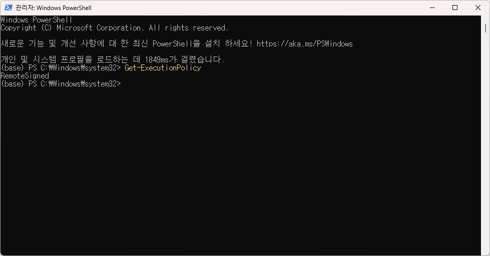 - 실행 정책을 RemoteSigned로 변경하는 명령어