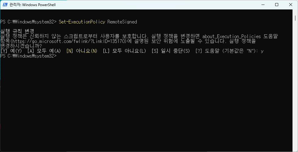 - 실행 정책을 RemoteSigned로 변경하는 명령어