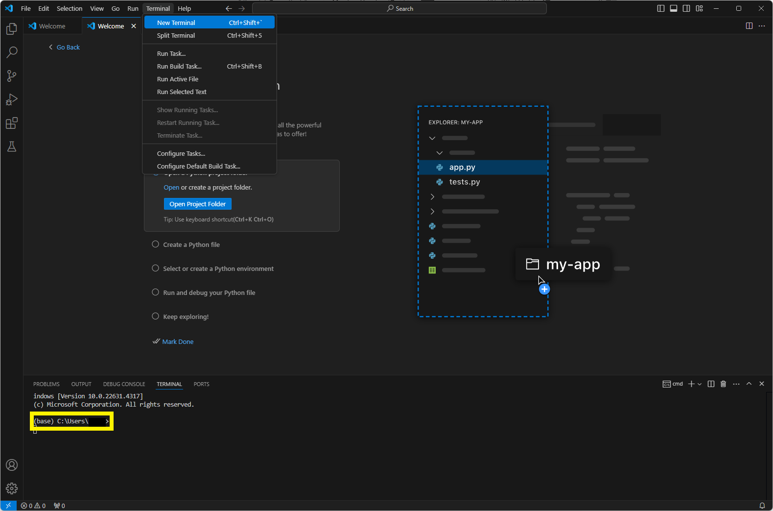 결과 확인: 변경 사항은 자동으로 저장됩니다. 위의 메뉴에서 Terminal > New Terminal 을 눌러 아래 터미널을 확인하면 conda 가상환경이 자동으로 활성화된 것을 확인할 수 있습니다.