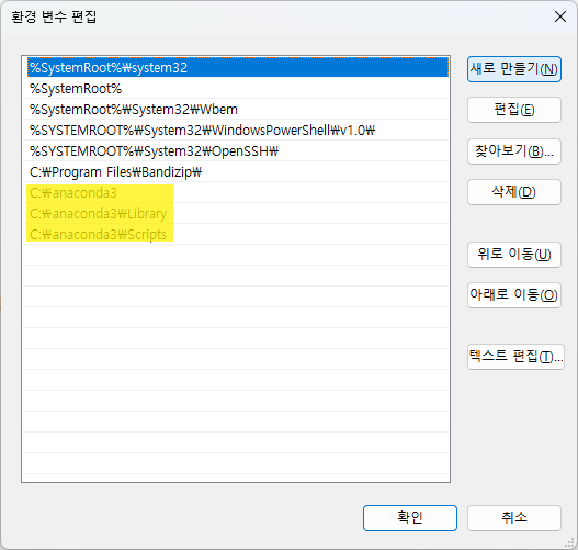 Path 추가: Anaconda가 설치된 경로를 찾아 다음 3개의 Path를 추가합니다. 사람마다 상이하니 Anaconda를 설치하실 때 지정한 경로를 입력해야 합니다. 그리고 다른 건 절대로 건드리시면 안됩니다. 아래는 예시입니다.