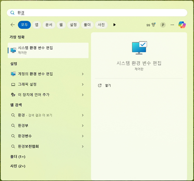 시스템 환경 변수 편집 실행: 시작 메뉴에서 시스템 환경 변수 편집을 실행합니다.