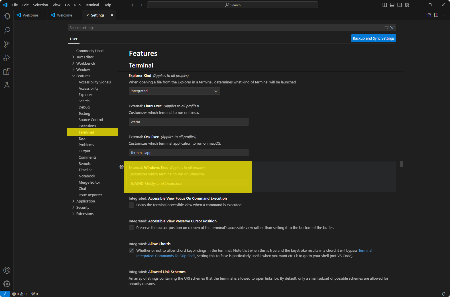 명령어 수정: VS Code를 실행한 뒤 차례대로 위의 메뉴에서 File > Preferences > Settings > Featrues > Terminal > External: Windows Exec 설정까지 진행합니다. 아래 그림에서처럼 터미널을 실행할 때 %WINDIR%\System32\cmd.exe 명령어를 이용합니다. 이를 %WINDIR%\System32\cmd.exe "/K" C:\anaconda3\Scripts\activate.bat C:\anaconda3 명령어로 변경합니다. 쉽게 말해 "터미널 실행할 때, 아나콘다 가상환경을 활성화해줘" 입니다. 위의 명령어는 자신이 아나콘다를 설치한 경로와 직접적으로 연관되어 있으니 꼭 자신의 경로에 맞게 명령어를 적어주셔야 합니다. 저 명령어를 그대로 쓰실려면 Anaconda를 설치하실 때 C 드라이브로 경로를 지정해주어야 합니다.