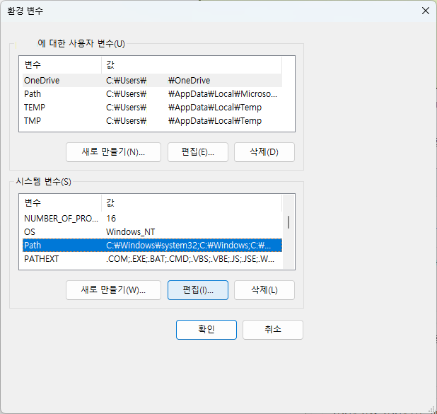 Path 편집: 시스템 변수(S)에서 Path 변수를 찾아 편집(I)...을 클릭합니다.