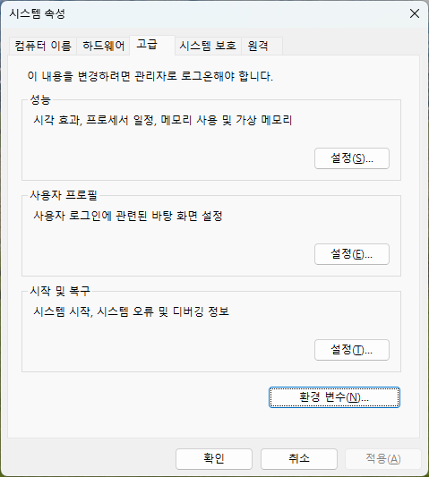 환경 변수 열기: 고급 탭에서 환경 변수(N)...을 클릭합니다.
